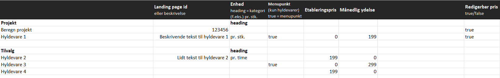 Produktet tilføjes ud fra ovenstående kolonnestruktur. Se eksempel på produktark herunder: